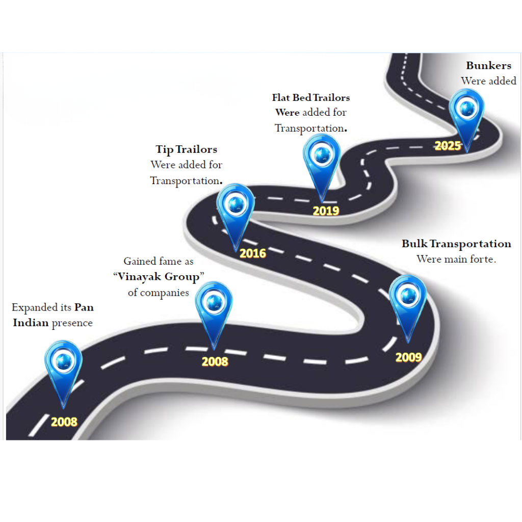 SVT Logistics has grown steadily over the years, beginning in 2008 when it expanded its presence across India and earned recognition as part of the renowned “Vinayak Group” of companies. By 2009, the company strengthened its operations with a strong focus on bulk transportation, establishing it as a core service. In 2016, SVT Logistics upgraded its capabilities by adding tip trailers to support more efficient movement of goods. This growth continued in 2019 with the addition of flat bed trailers, further enhancing its transportation portfolio. Moving into 2025, the company expanded once again by introducing bunkers, marking another milestone in its journey of continuous development and service enhancement.