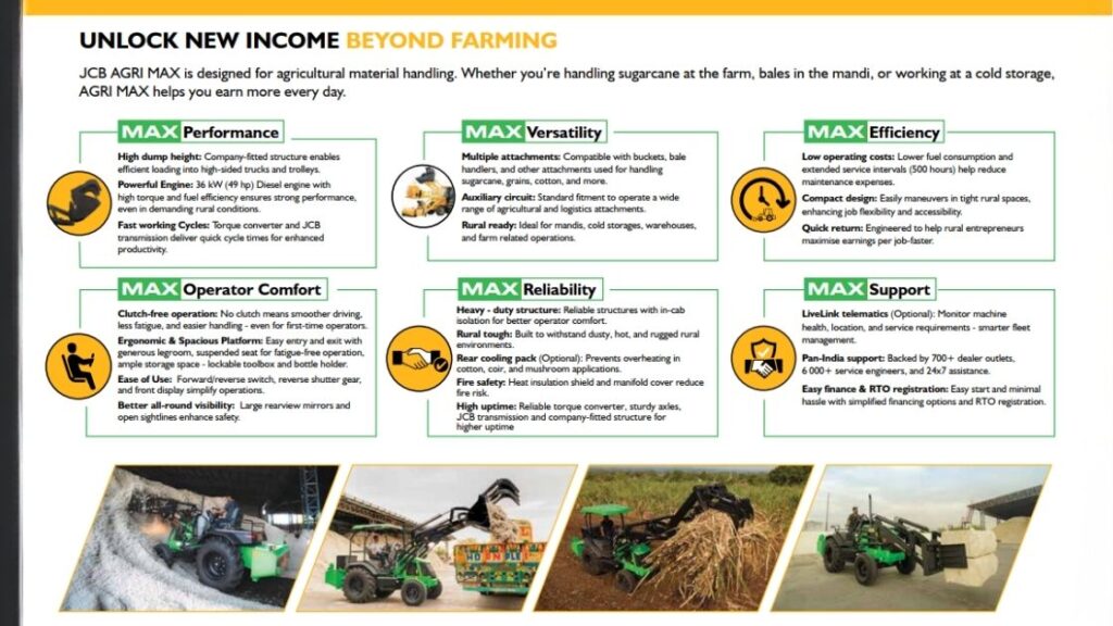 An agricultural tractor is a powerful machine used in farming to pull, push, lift, or operate various agricultural implements. Tractors help farmers increase productivity, reduce manual labor, and work efficiently across different types of farmland.JCB AGRI MAX is designed for agricultural material handling. Whether you’re handling sugarcane at the farm, bales in the mandi, or working at a cold storage, AGRI MAX helps you earn more every day.